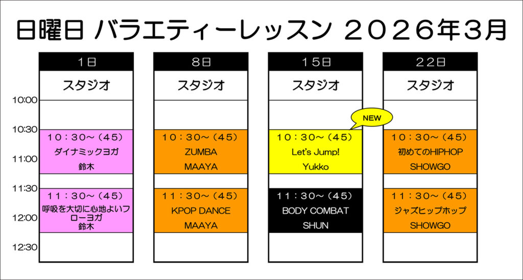 2026年3月の日曜日のスタジオレッスンバラエティー枠となります。